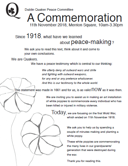 News and Events White Poppies for Peace – a centenary event to remember all victims of wars November 4, 2018 quakersireland Dublin Quakers invite members of the public to an event on 11th November from 9am to 3.30pm in Merrion Square – readings and silence around 11am. Share this: Click to email a link to a friend (Opens in new window) Email Click to print (Opens in new window) Print Like Loading...