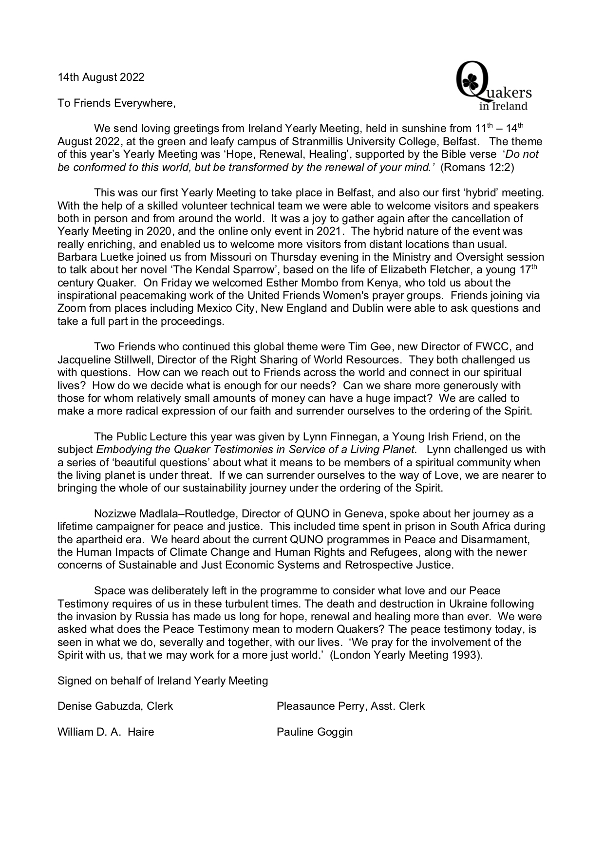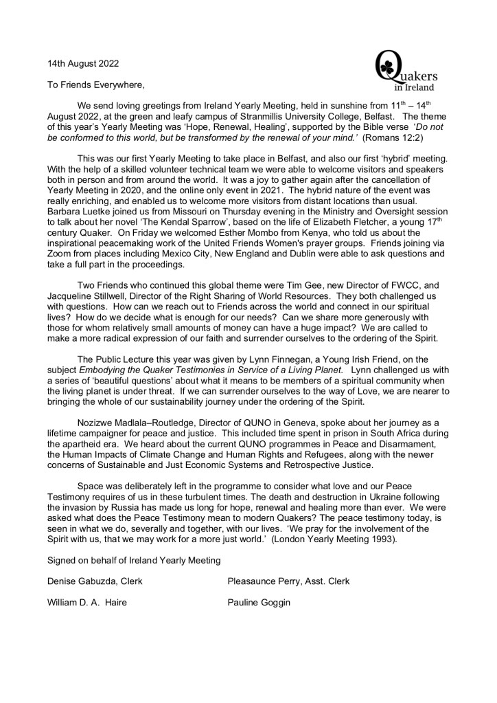 News and Events IYM 2022 Epistle Image August 16, 2022 quakersireland A signed copy of the Epistle is available here. Share this: Click to email a link to a friend (Opens in new window) Email Click to print (Opens in new window) Print