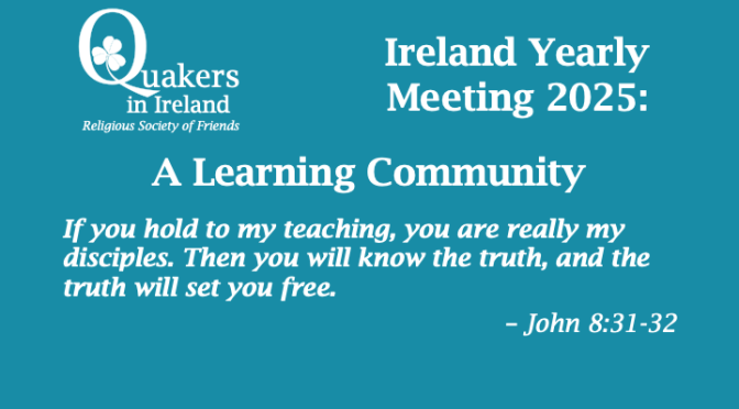 Ireland Yearly Meeting will be held on 25 – 27 April 2025 at Friends School Lisburn. (Ireland Junior Yearly Meeting will be held just before, on 17 – 21 April 2025 at Newtown School Waterford. You can find out more about JYM 2025 here.)