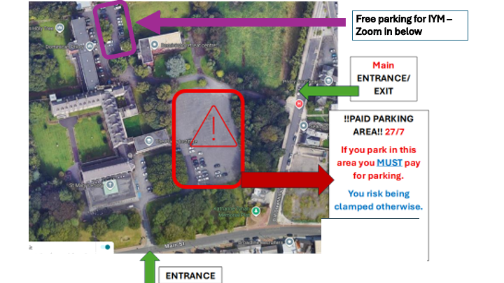 Two photos from above show the area of free parking for those attending IYM and the parking area where you must pay to avoid being clamped.