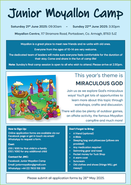 The Junior Moyallon Camp is for young people aged 10-14. This year, it is taking place during 21-22 June, 2025. Here are links to the 2025 Junior Moyallon Information flyer and registration/consent form.