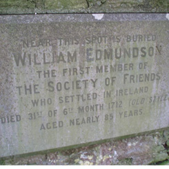 for his Quaker activities. He and his family moved south to Cavan, and then to Mountmellick, to escape further persecution. Edmundson became known as a charismatic speaker, with a reputation for sincerity and integrity, and was frequently imprisoned. He travelled all over Ireland spreading the Quaker message, and later to Barbados, Jamaica, Virginia, the Carolinas and New England, where he also met peaceably with Indian leaders. He continued his Quaker work until he died in 1712.