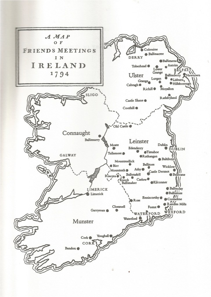 Quaker Meetings in Ireland have always been concentrated in the North, East and South of the island, as seen on this map of Friends Meetings in Ireland in 1794. About 50 Meetings are marked on this map.